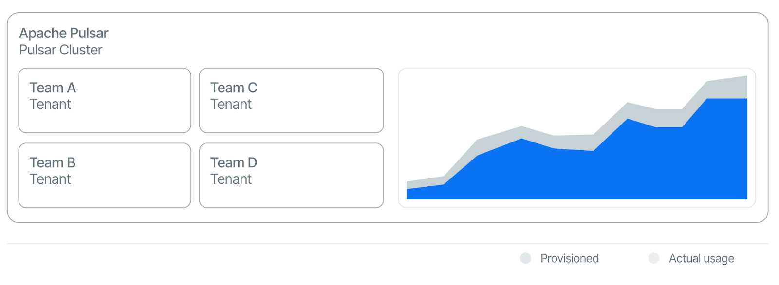 - Lower cost: Companies adopting Apache Kafka often require multiple Kafka clusters to cater to different teams within an organization, primarily due to the inherent limitations in Kafka’ architecture (See Figure 8). This scenario typically leads to each cluster operating at less than 30% capacity. Conversely, Apache Pulsar allows for the use of a single, multi-tenant cluster. Such deployment facilitates cost-sharing across various teams and enhances overall resource utilization. By pooling resources, organizations can significantly diminish the fixed costs and reduce the total cost of ownership, as resources are more efficiently allocated and used (See Figure 9).