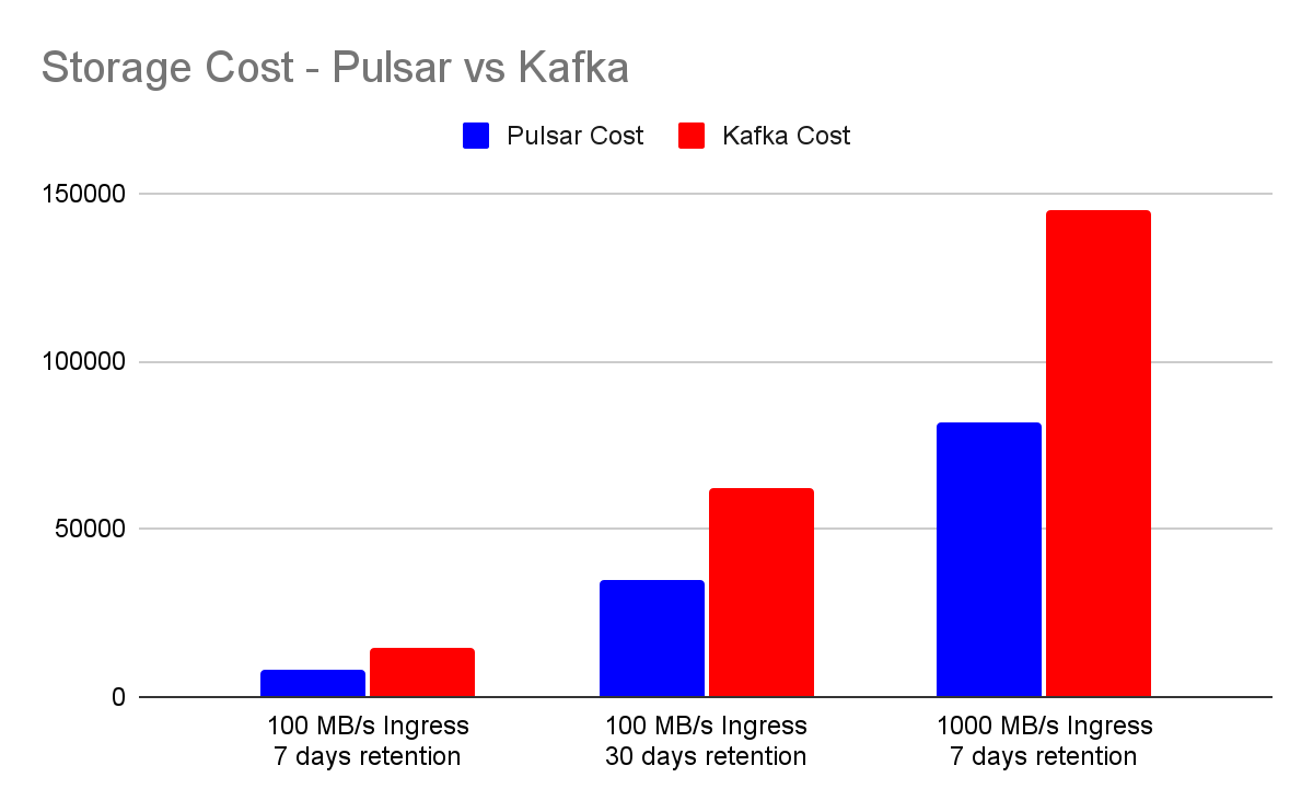 We compare the storage costs of Pulsar and Kafka with different ingress and data retention.