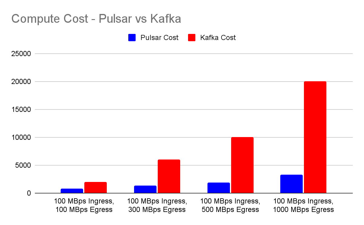 Compiling the data from various workload scenarios highlights the significant difference in computing costs between Apache Pulsar and Apache Kafka. Notably, Pulsar offers a compute cost advantage, being 2.5 times more cost-effective than Kafka. The costs of Apache Kafka increase linearly as the egress rate increases because Kafka has to provision resources to meet egress requirements, which results in the unnecessary overprovisioning of ingress and the processing power of storage components.