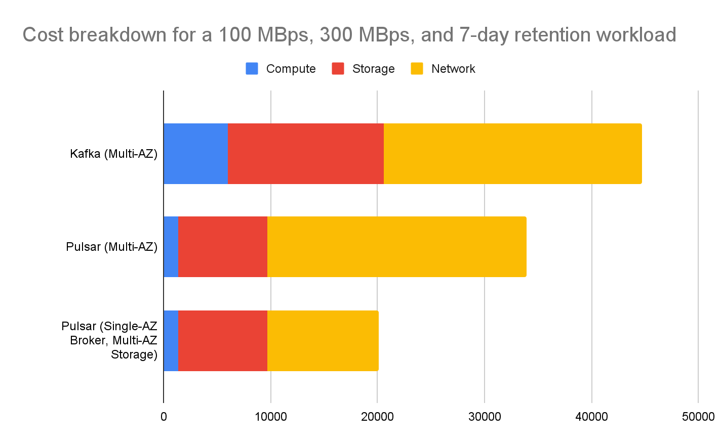We're consolidating compute, storage, and networking expenses to assess the overall infrastructure costs of Pulsar versus Kafka. In a standard deployment scenario with 100 MBps ingress, 300 MBps egress, and a 7-day data retention workload, Pulsar offers a 77% reduction in compute costs and nearly a 60% reduction in total infrastructure costs, including both storage and network expenses.