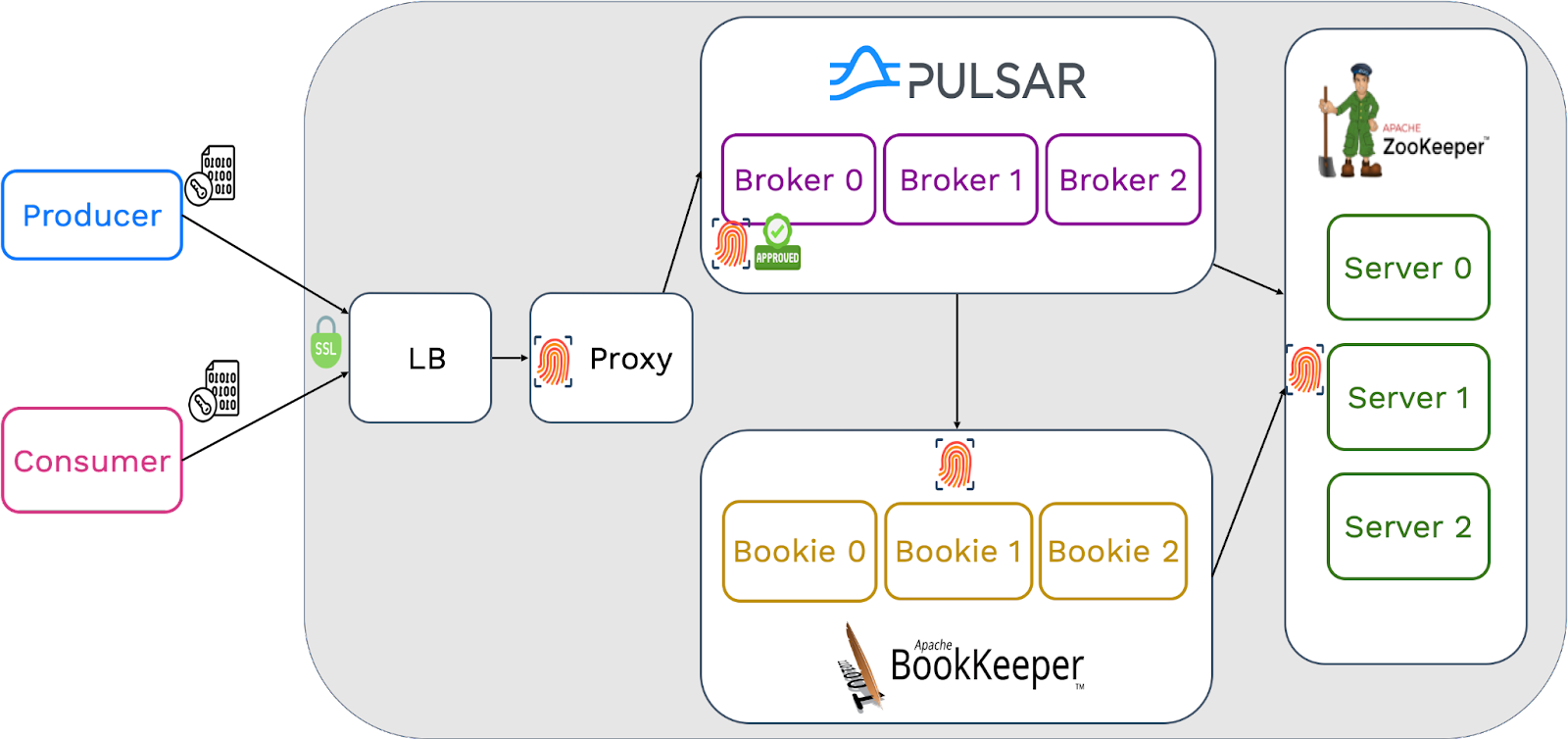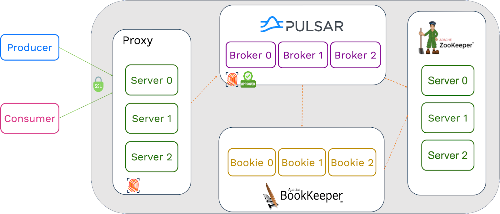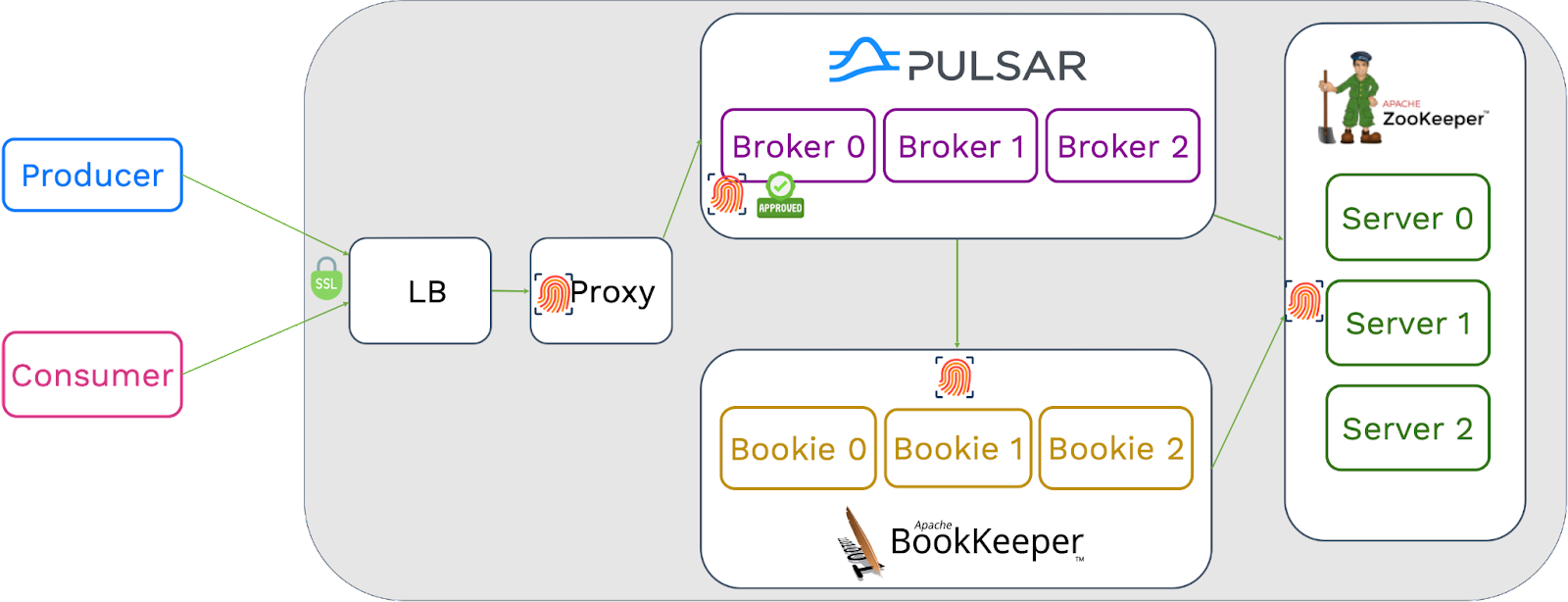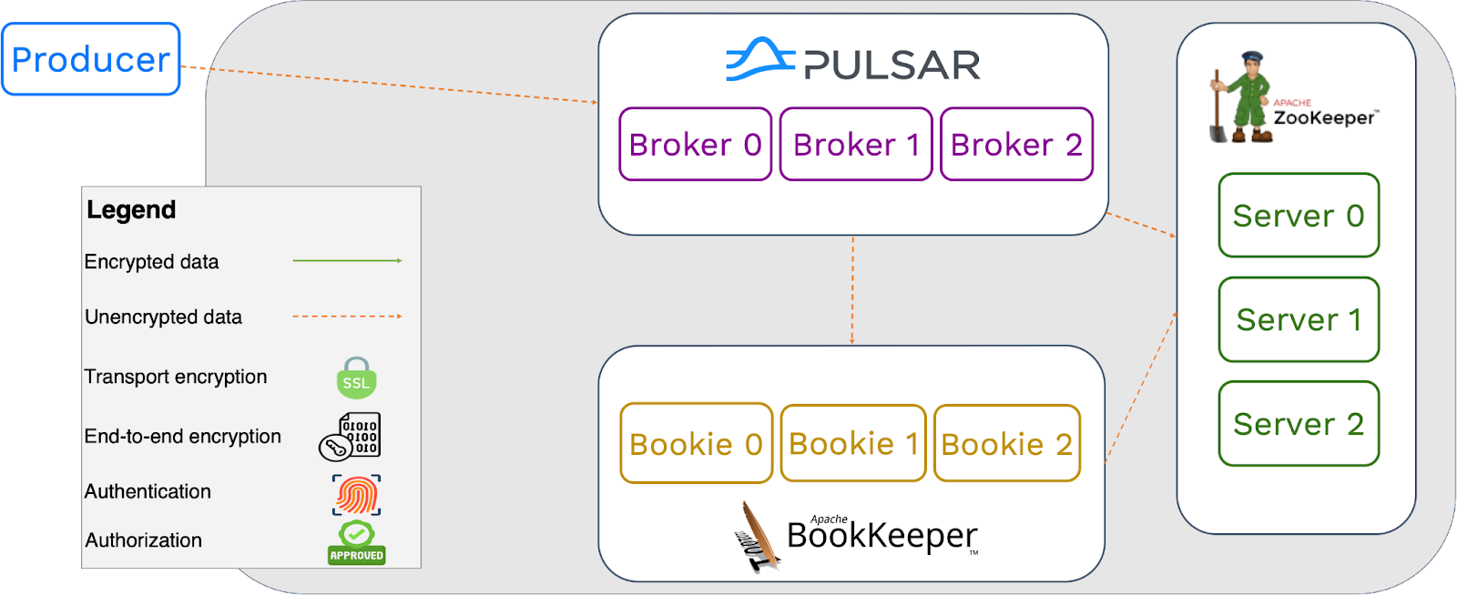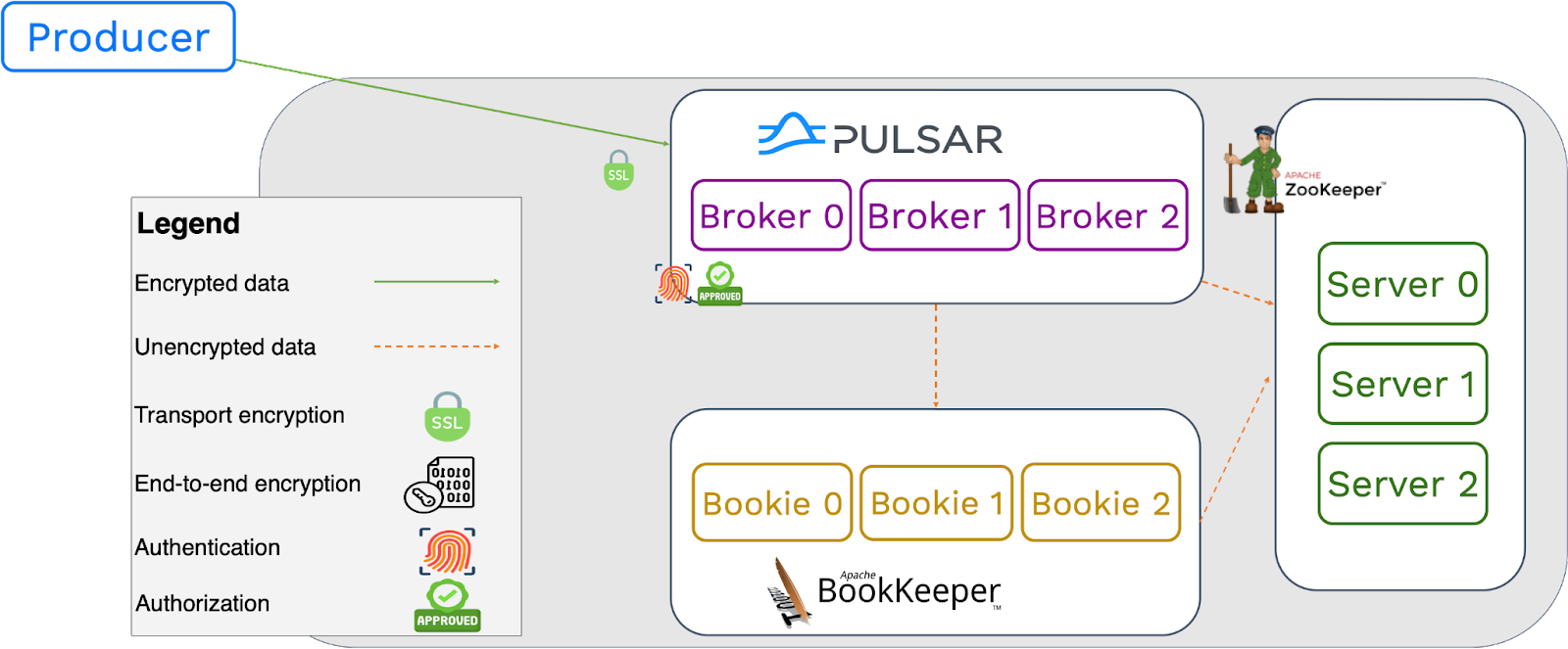 Producers can send data to Pulsar brokers with SSL encryption. The decryption process may require some cluster resources and, to some extent, can impact cluster performance, which is usually acceptable. For interactions between brokers, bookies and ZooKeeper, as no authorization or authentication policy is applied, performance, latency, and throughput within the cluster are not affected.