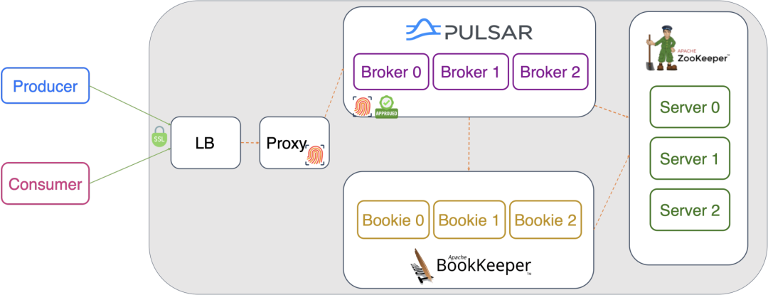 Figure 1 shows an example of Full Link Trusted. In this setting, all components within the cluster have direct access to others and no encryption mechanism is applied. For example, producers can send messages to Pulsar in plain text without any authentication. This configuration is suitable for internal tests or feature validations.