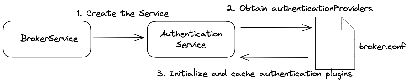 - When the broker starts, it runs the BrokerService, which creates the AuthenticationService.