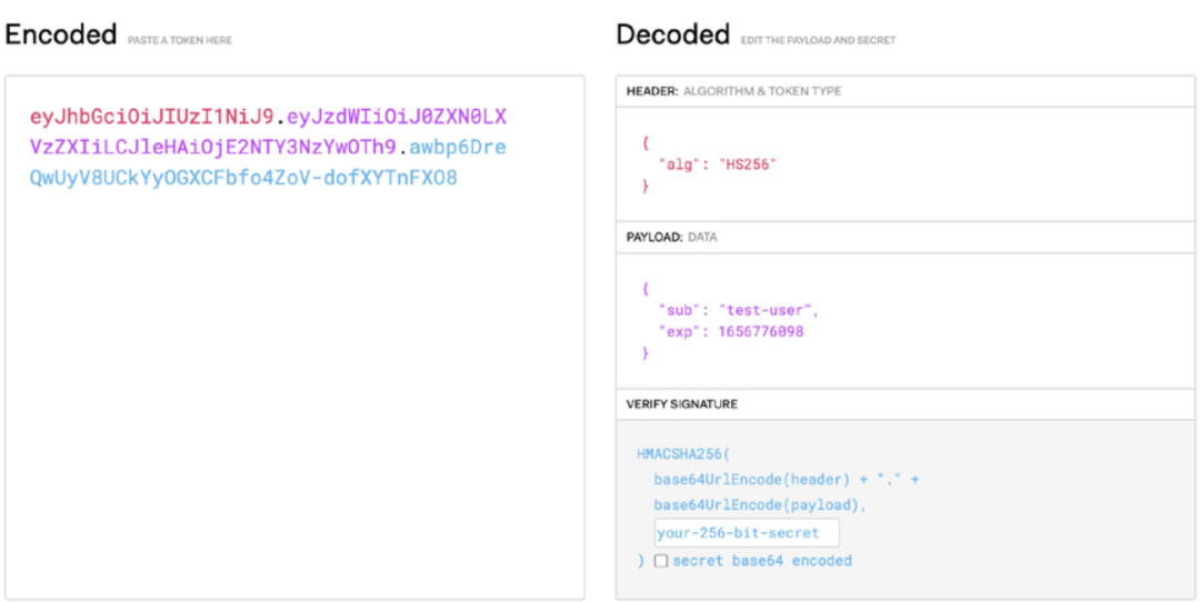- Signature: Specifies the algorithm to ensure the token is not changed, encoded by the header, the payload, and a secret.