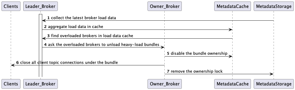 For the unloading request, the owner broker removes the target bundles’ ownerships in the metadata store and closes the client topic connections. Then the clients reinitiate the broker discovery mechanism. Eventually, the leader assigns less-loaded brokers to the unloaded bundles and the clients connect to them.