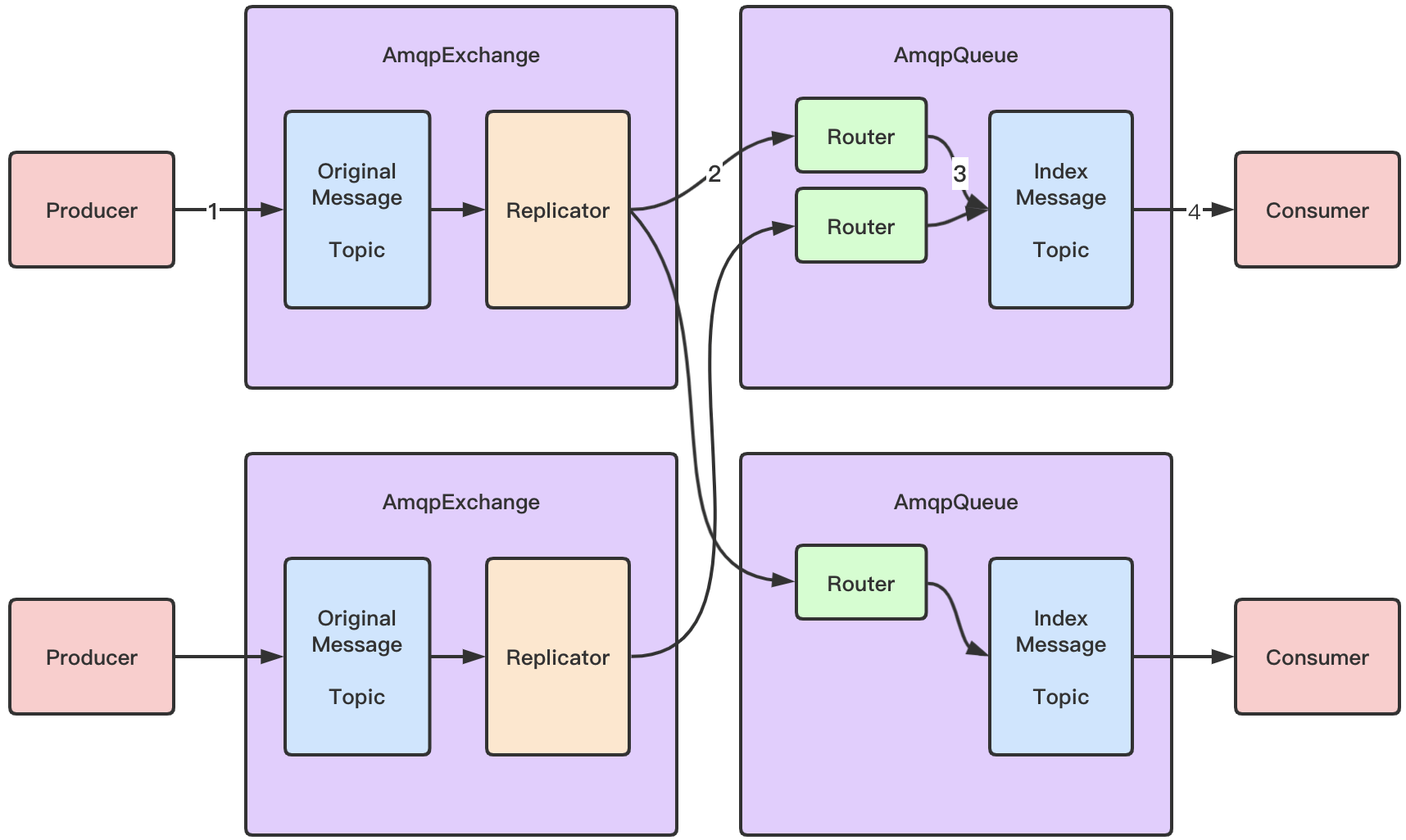 An AmqpQueue has an index message Topic that stores IndexMessages that are routed to this queue. The IndexMessage consists of a message ID of the original message and the exchange name where the message comes from. When the AmqpQueue delivers messages to the consumers, it will read the original message data by the IndexMessage and dispatch the original message data to the consumers.