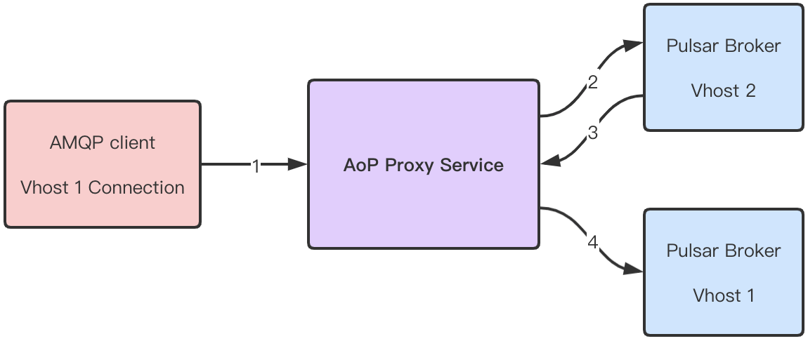 The AoP Proxy is for finding the owner broker responsible for the Vhost when the client connects to the AMQP server and transfers data between the client and the owner broker. As described in the above section, the target Vhost is served by a broker in the cluster. This can be achieved by the topic lookup mechanism in Pulsar. This is why a Vhost can only be backed by a namespace with a single bundle. If the namespace has multiple bundles, we cannot find the owner broker by the Vhost name.