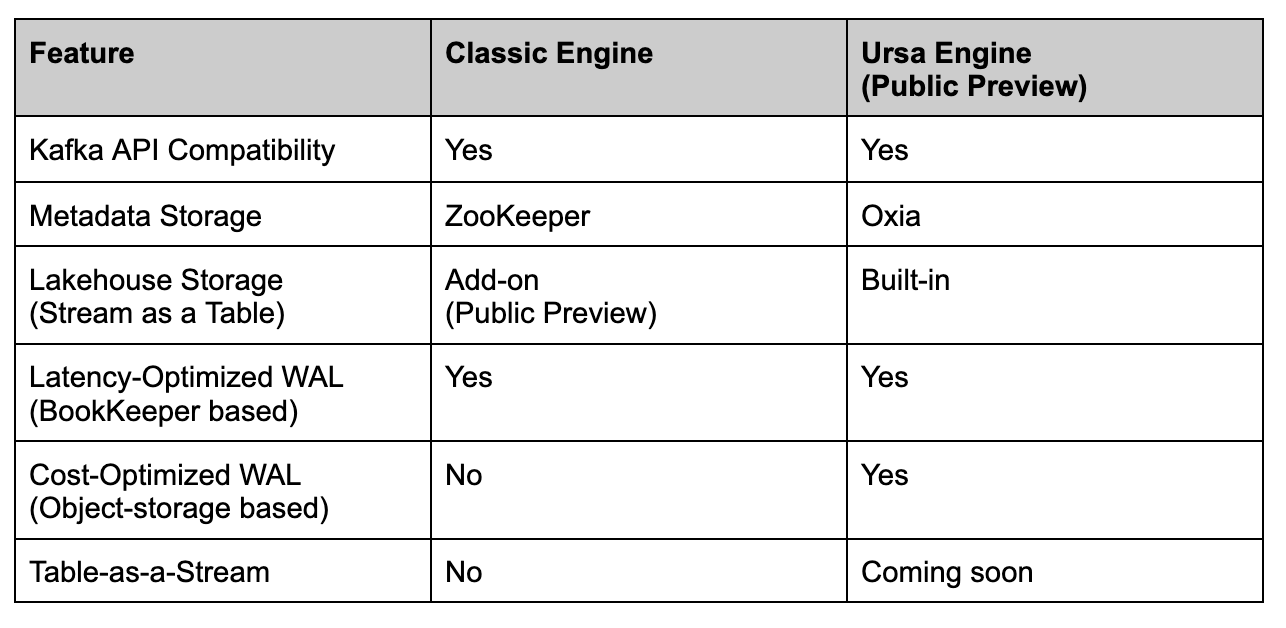 The Kafka API compatibility and Lakehouse Storage are available as add-ons for Classic Engine users. However, Oxia and S3-based WAL are integral to the Ursa Engine and cannot be retrofitted onto existing clusters.