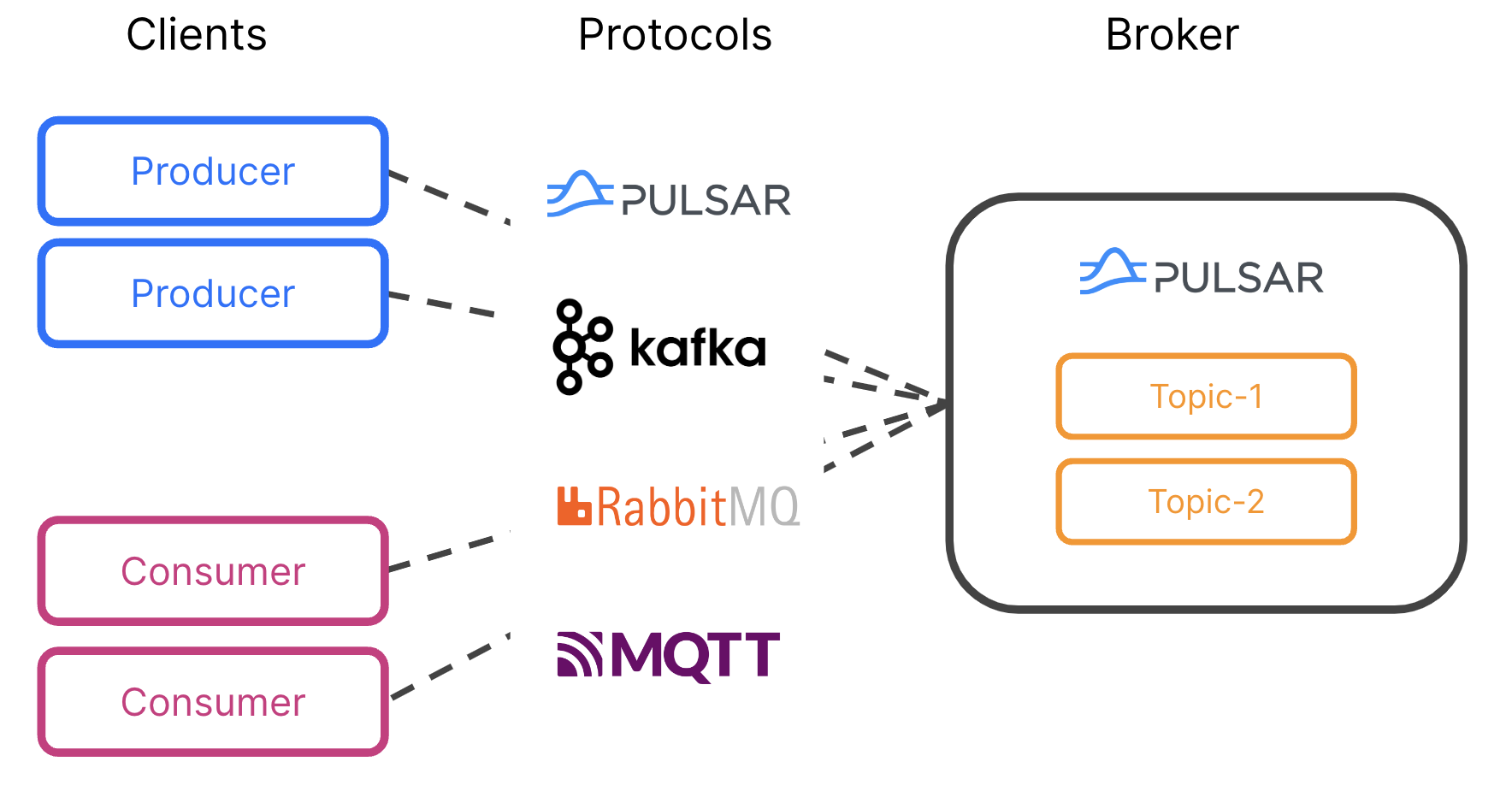 Protocol Handlers in Apache Pulsar offer compatibility with Apache Kafka, RabbitMQ, and MQTT producers & consumers. They facilitate a more fluid migration process from one of these platforms to Pulsar.