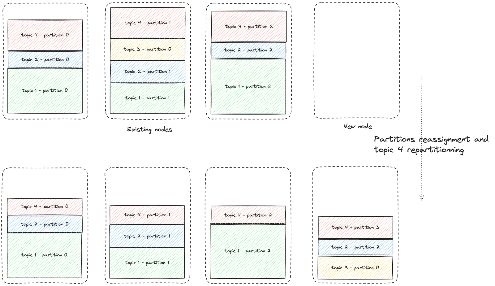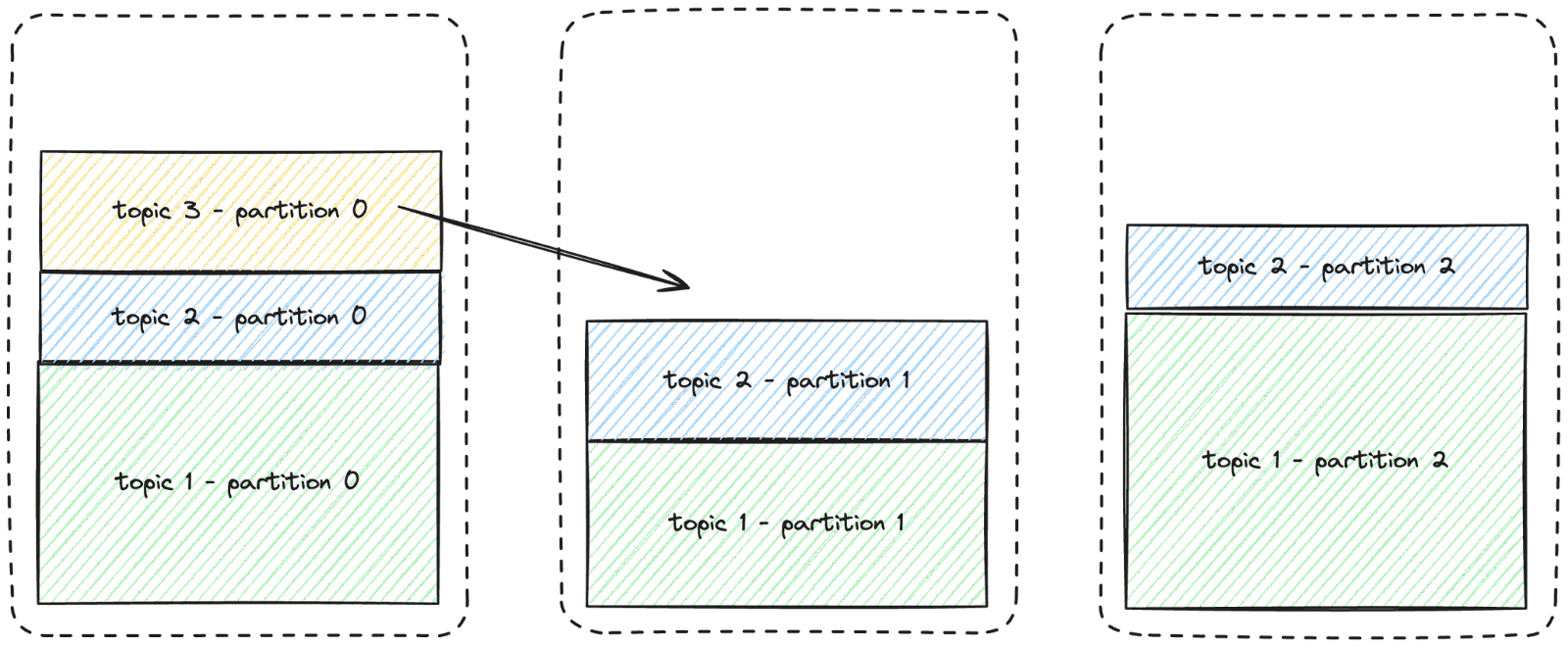 Kevin generates a partition assignment plan and executes it to move these partitions so the cluster can accommodate the new topic’s data, as illustrated below: