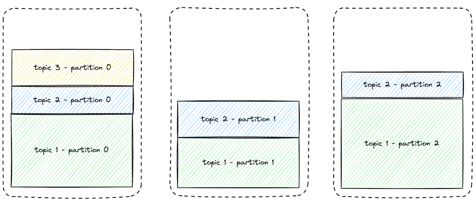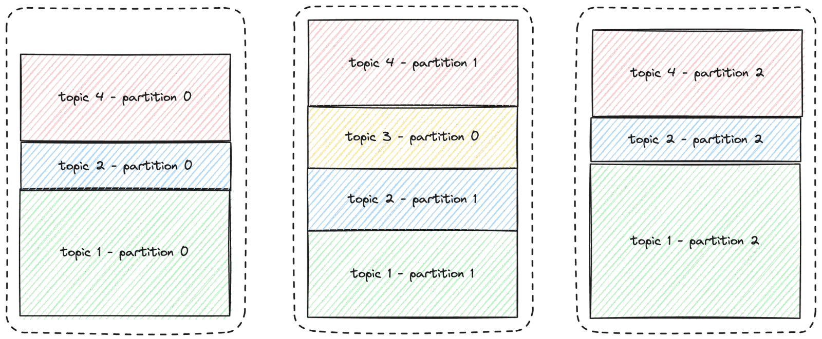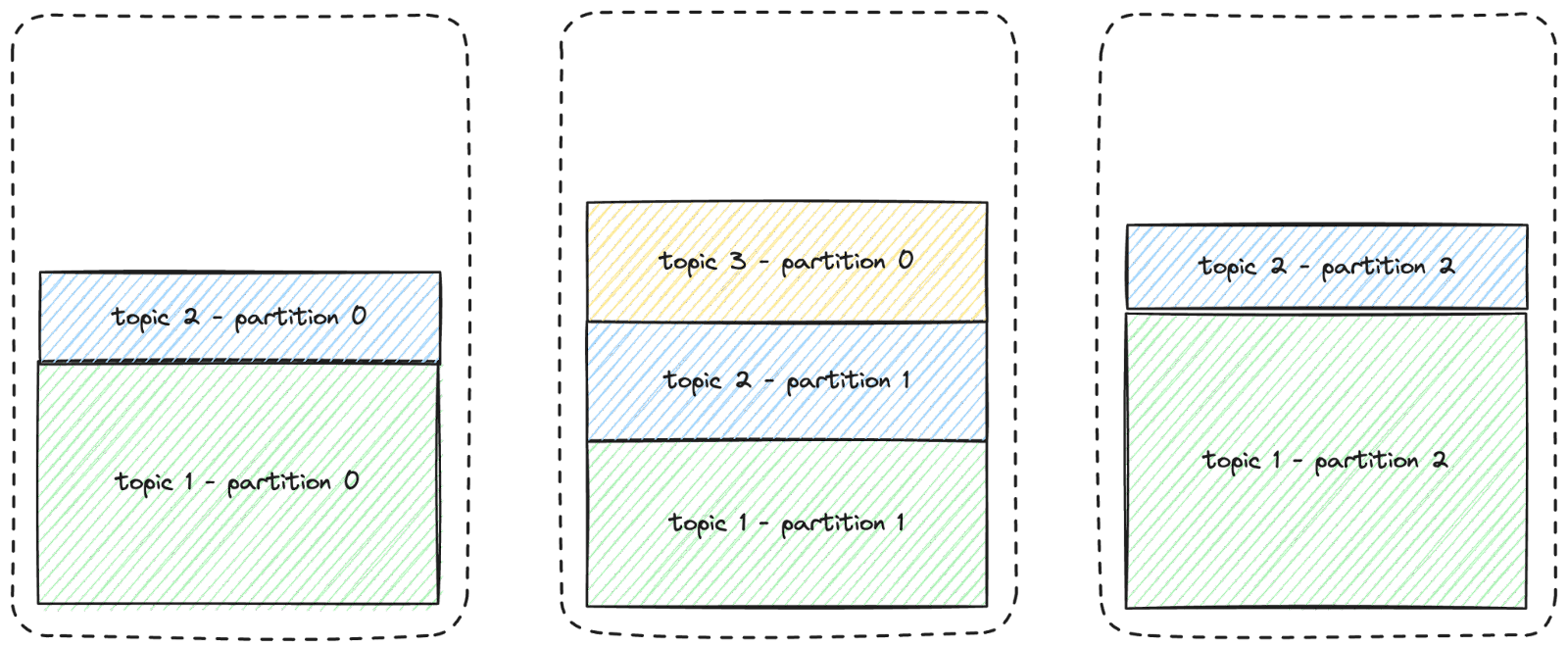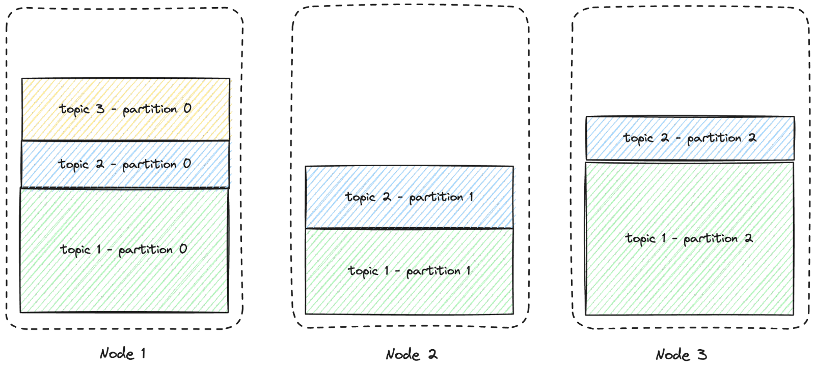 This is illustrated in the diagram below. For improved readability, only three nodes and three topics are depicted, and the replicas are not displayed.