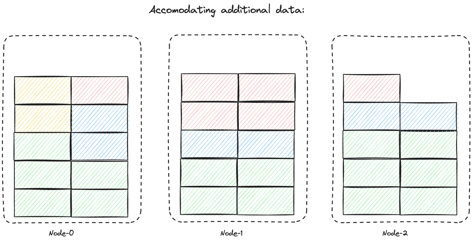 Therefore, Kevin's only option to prevent data loss is to rebalance the partitions across nodes. The (very simplified) diagram below illustrates this concept. The yellow partition needs to be moved to another node to create space on the first node.