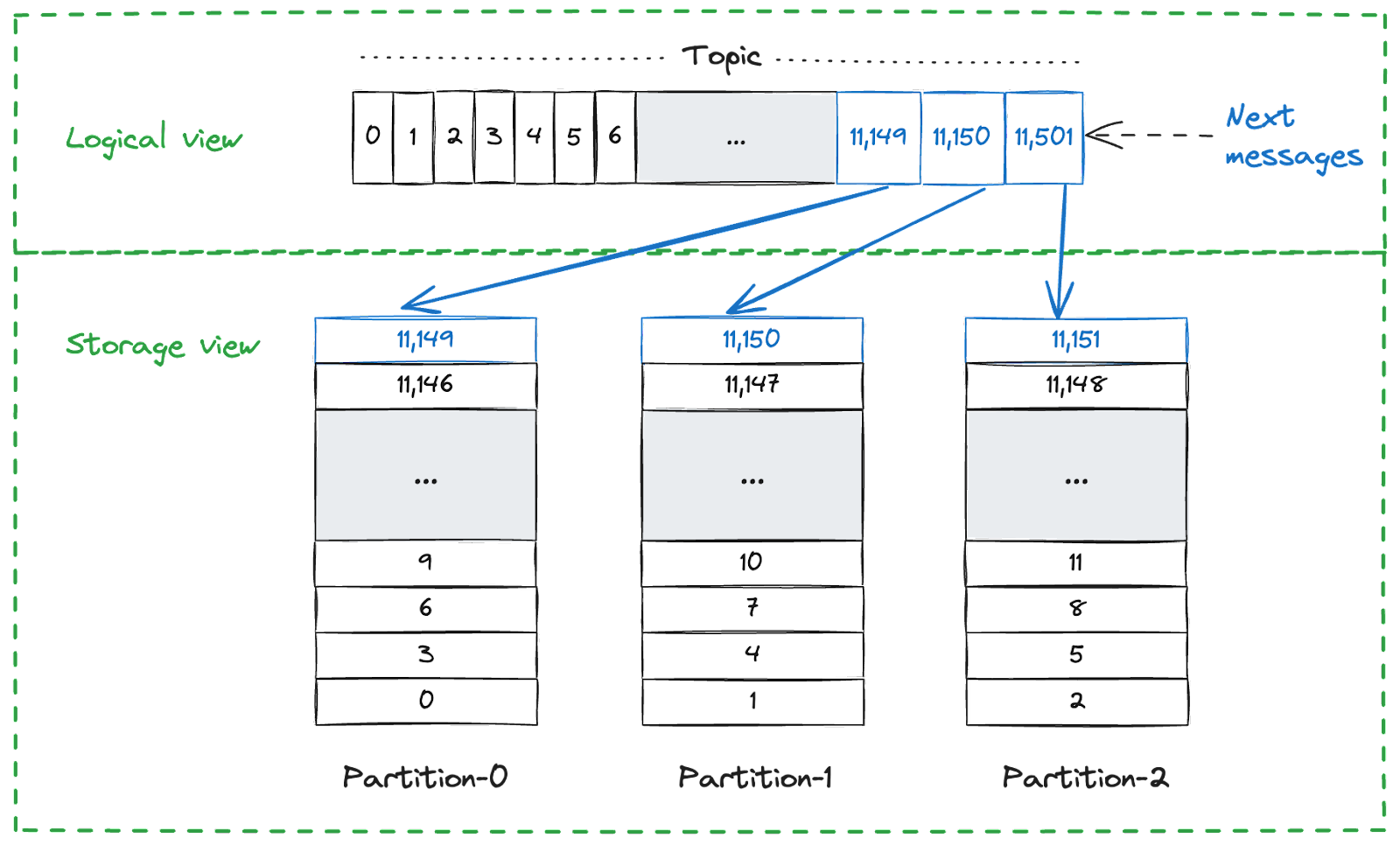 Using the segment-based storage model above, adding more data is not capped by a single disk. The data distribution across the nodes is not coupled to the distribution of message keys in the topics. This allows a single topic to efficiently use the storage available across the entire cluster, as illustrated below: