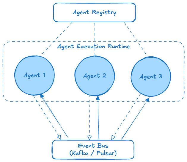 - Shared Event Bus: At the heart of the system is a high-throughput, low-latency event bus that all agents connect to. This is typically a publish/subscribe messaging system (e.g., Apache Pulsar or Kafka topics) that delivers events to any agent that subscribes. The event bus decouples senders and receivers — agents produce events without knowing who will consume them, and agents consume events without tight coupling to producers. This loose coupling via events is what enables agents to coordinate and share context in real time. The event bus should support persistent, replayable streams (for durability and to allow new agents to catch up on past events if needed), and it becomes the communication backbone for the agents.