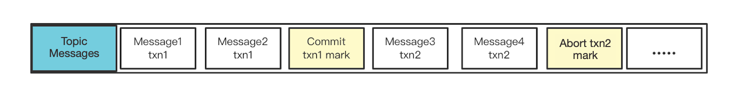 When committing or aborting a transaction, a commit mark or abort mark will be appended to the topic ledger. The mark is not a real message and is not available to the client. It is only used to identify whether the transaction has been committed or aborted. These marks are stored in BookKeeper as shown below.
