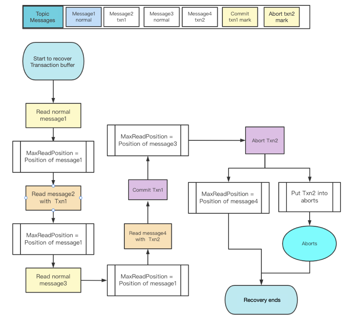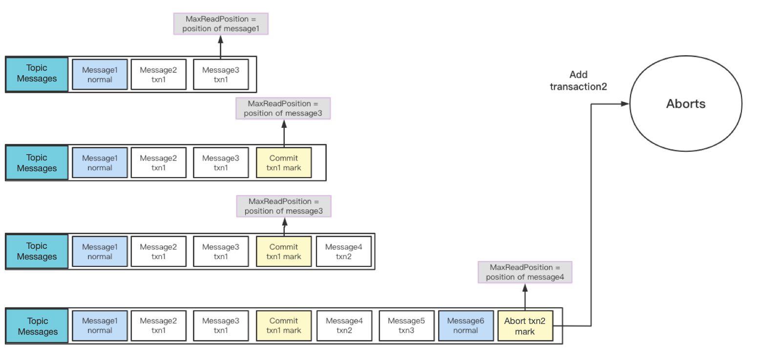Transaction marks are mainly used for transaction buffer recovery. The transaction buffer reads entries from the topic’s managed ledger. When it detects a committed mark or an aborted mark in the ledger, it removes the transaction from ongoingTxns and updates maxReadPosition accordingly (I will explain these two attributes later).
