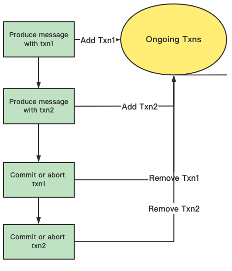 The transaction buffer will obtain the lowWaterMark information when committing or aborting a transaction and store it in the transaction buffer. The lowWaterMark makes sure messages are not sent to the transaction buffer with ended transactions. Nevertheless, this is just a best-effort guarantee. Therefore, after each commit or abort operation, the lowWaterMark will be used again to check whether there is an ended transaction in ongoingTxns. If there is, the transaction will be aborted.
