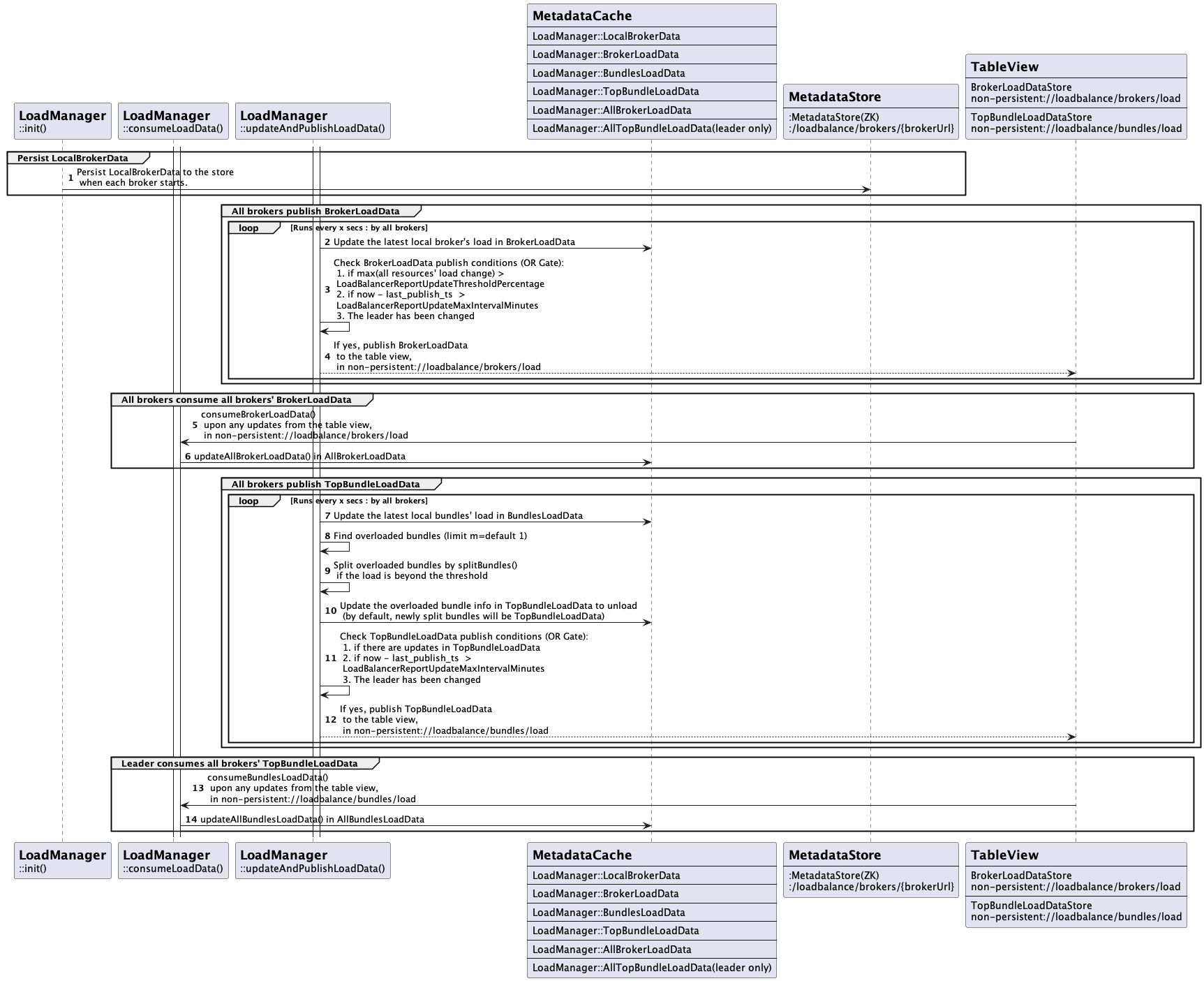 The exchange of load data holds significant importance in achieving optimal load balancing, as incorrect or sluggish load data can negatively affect balancing efficiency. In this new design, brokers periodically share their broker load and top k bundle load data by publishing them to separate in-memory system topics. Each broker utilizes this broker load data for assignments and its local bundle load data for splitting, while the leader broker triggers the global bundle unloading based on both global broker and bundle load data. This new design decouples load data stores depending on the use cases to clean the data model and ensure the modularity of the load-balancing system.