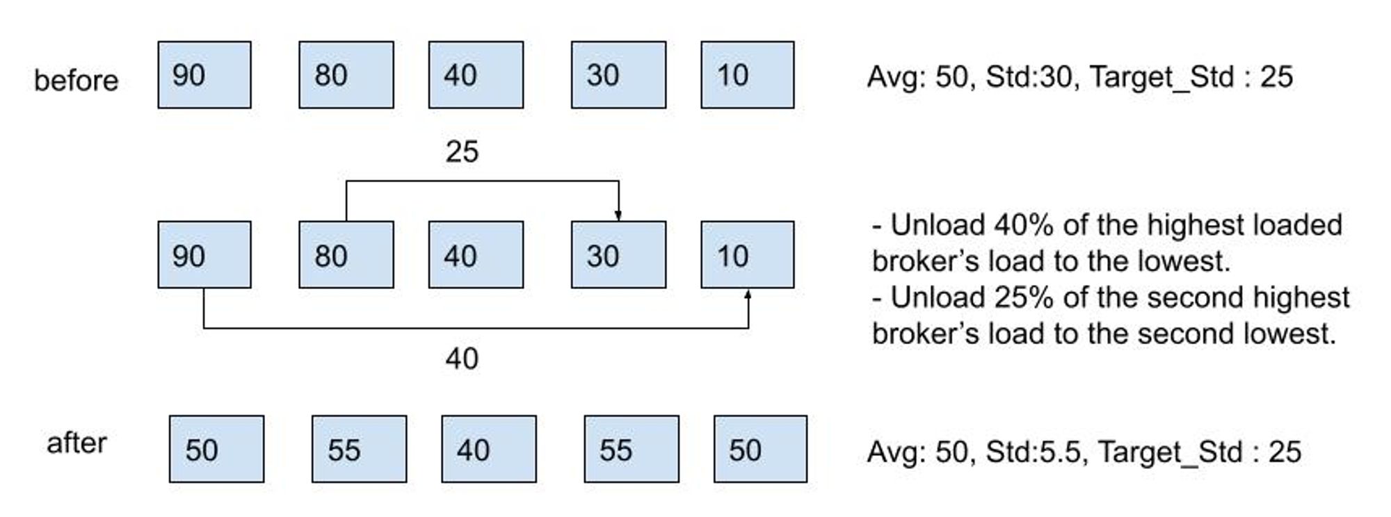 Essentially, the goal is to keep the load distribution under the target at minimal steps. For this, TransferShedder tracks the global load score distribution(Standard Deviation) and tries to keep it lower than the configured threshold, loadBalancerBrokerLoadTargetStd, by moving the loads from the highest to the lowest loaded brokers. If there are any outliers (significantly underloaded or overloaded brokers), it will try to prioritize them to unload.