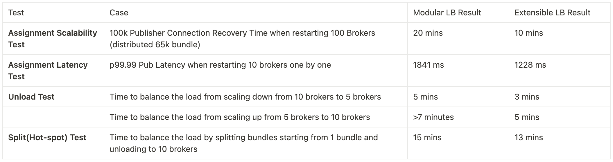 Extensible Load Balancer reduced the ZK dependencies in Pulsar by Pulsar native topics and table views. Along with this architectural design change, the test data shows that distributed load balance decisions, optimized load data and ownership data sharing, and new load balance algorithms with the bundle transfer option help to improve the broker load balance performance.