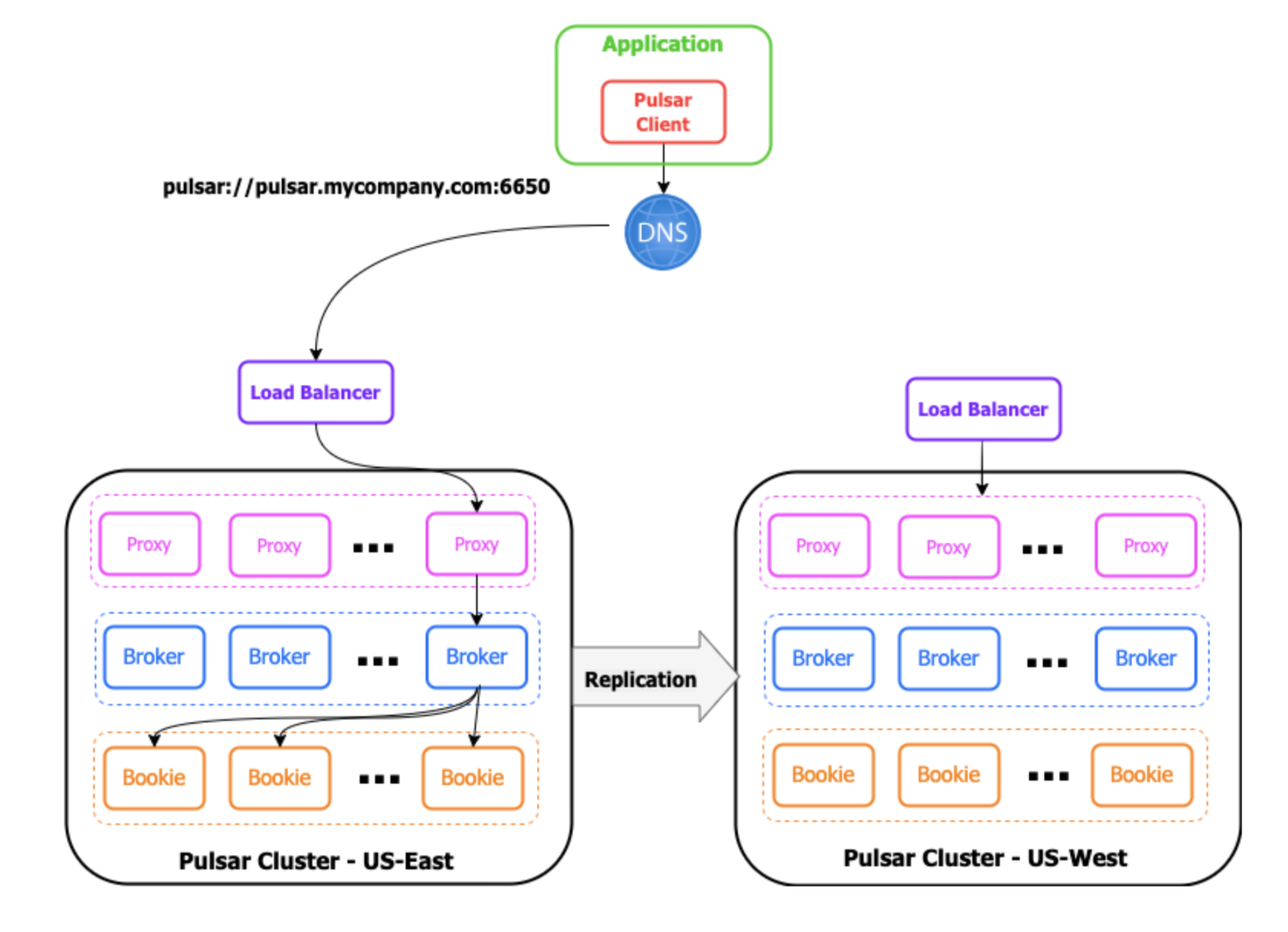 To ensure continuous availability, the Pulsar clients are configured to use a single static URL to connect to the load balancer that sits in front of the Pulsar proxies. The DNS record is updated to point to the regional load balancer of the “active” cluster, which, in turn, routes all the traffic on to the Pulsar brokers in that cluster. It doesn’t matter which proxy instance is chosen, because they all perform exactly the same function and forward the traffic to the proper Broker, based on the topic name.