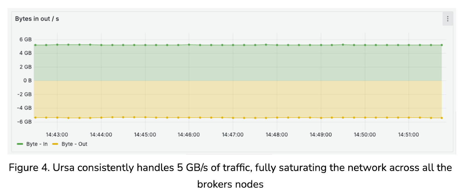 The following diagram demonstrates that Ursa can consistently handle 5 GB/s of traffic, fully saturating the network across all broker nodes.