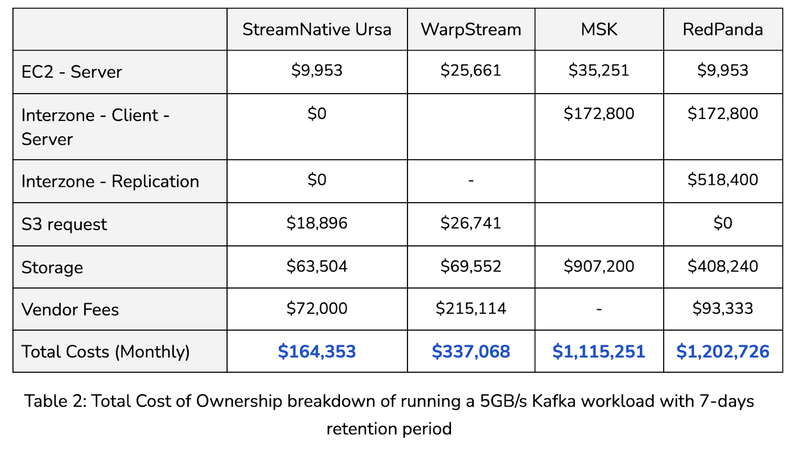 Beyond infrastructure costs, when factoring in both storage pricing, vendor pricing and operational expenses, Ursa’s total cost of ownership (TCO) for a 5GB/s workload with a 7-day retention period is: