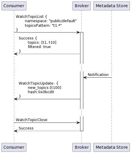 As shown in Figure 4, consumers register as watchers with brokers. The initial exchange resembles what we’ve discussed in the sections above. The difference is that the broker keeps track of watchers. Brokers get notifications from the metadata store whenever a new topic is created (possibly through another broker) and immediately send a message to the consumers that registered with a pattern that the new topic’s name matches. This way, the consumers can know about newly created topics within seconds.