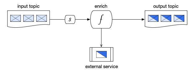 In an enrichment pattern, messages are received from an input topic, and then processed by a function. The function sends requests to an external service to augment the data in each message, and then passes the enriched messages on to the output topic.