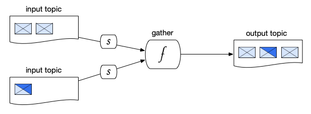 In a gathering pattern, a function merges messages received from multiple input topics and publishes them to a common output topic for downstream processing. This pattern is a critical component in machine learning workflows, as it collects and prepares data for model scoring.