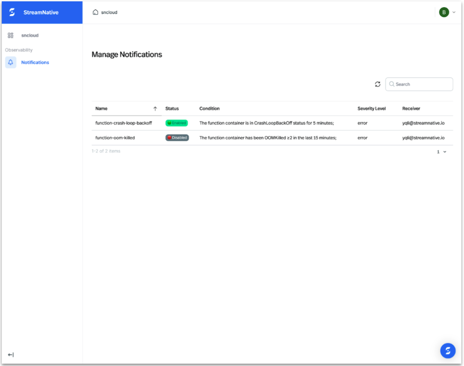 With this initial release, notification is scoped specifically to StreamNative Functions. Our built-in notification rules allow you to quickly gain visibility into issues before they impact production. Today, we offer two types of preconfigured rules that cover common failure scenarios and health checks.