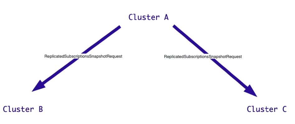 Figure 6. Cluster A sends a ReplicatedSubscriptionsSnapshotRequest to both clusters