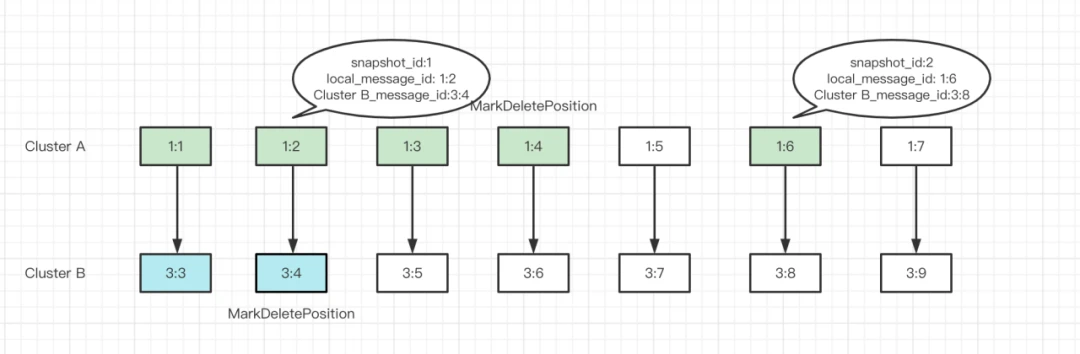 In the example in Figure 8, Cluster A has two snapshots on message 1:2 and message 1:6 respectively. When the markDeletePosition of Cluster A points to message 1:4, the markDeletePosition of Cluster B can move to message 3:4 as it knows the same message has already been acknowledged according to the snapshot.