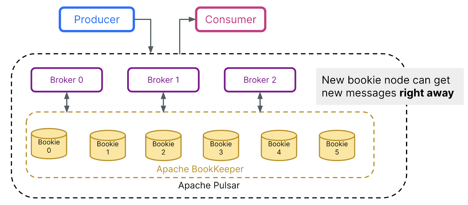 With Apache Pulsar, scaling up is 1000x faster than with Apache Kafka—without the typical burdens of capacity planning, data rebalancing, or other operational challenges involved in scaling streaming data infrastructure. The key to this 1000x elasticity is Apache Pulsar’s rebalance-free architecture.