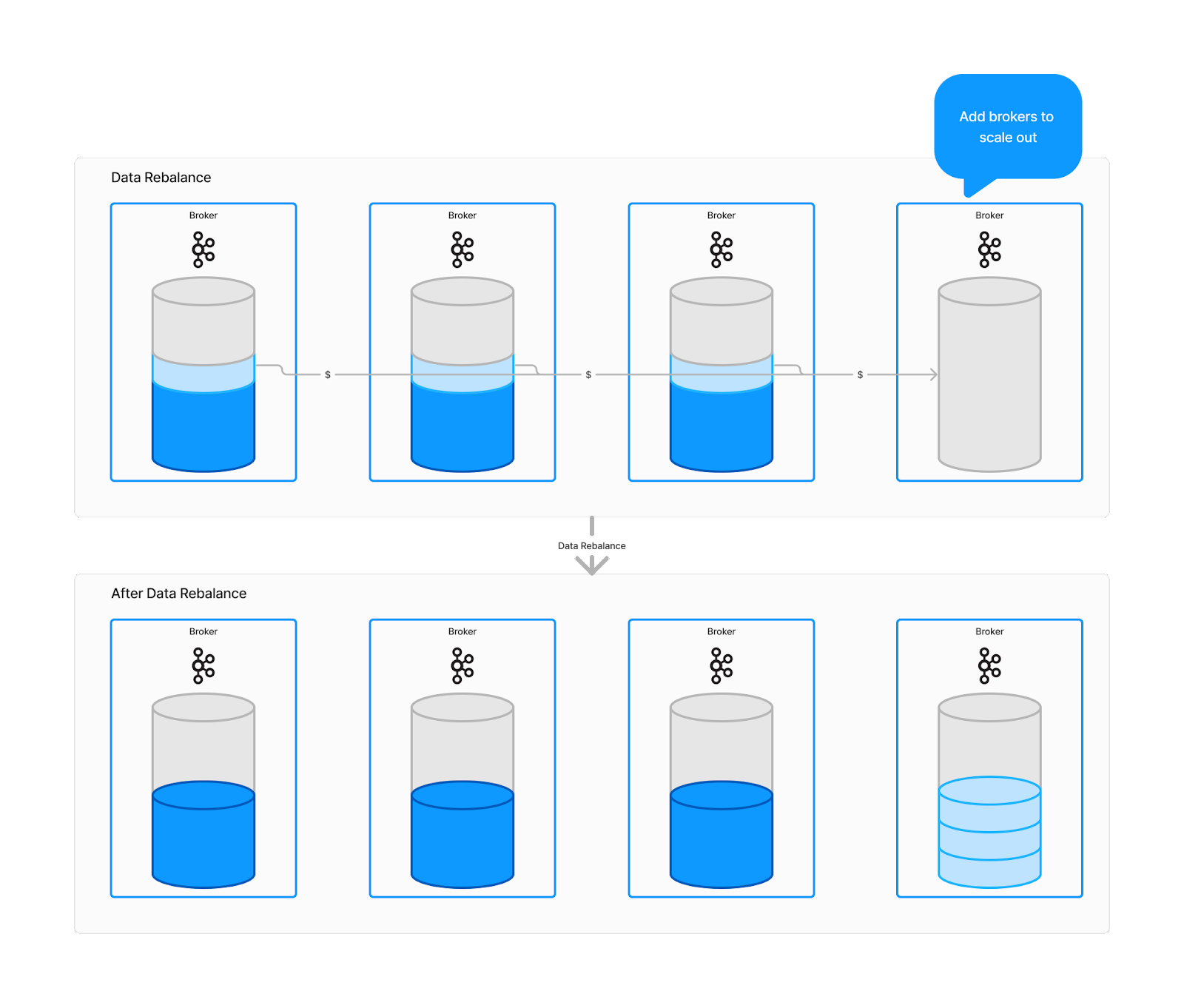 When the cluster is expanded by adding another broker to increase capacity, the dynamics change. Now with four brokers, the new broker must be integrated to start handling reads and writes. Assuming optimal data balancing, this new broker would need to store about 194.4 TB (777.6 TB divided by 4), which must be transferred from the existing brokers. On a 10 gigabit network, this data rebalance would take about 43 hours using Apache Kafka, and potentially even longer in practical scenarios.