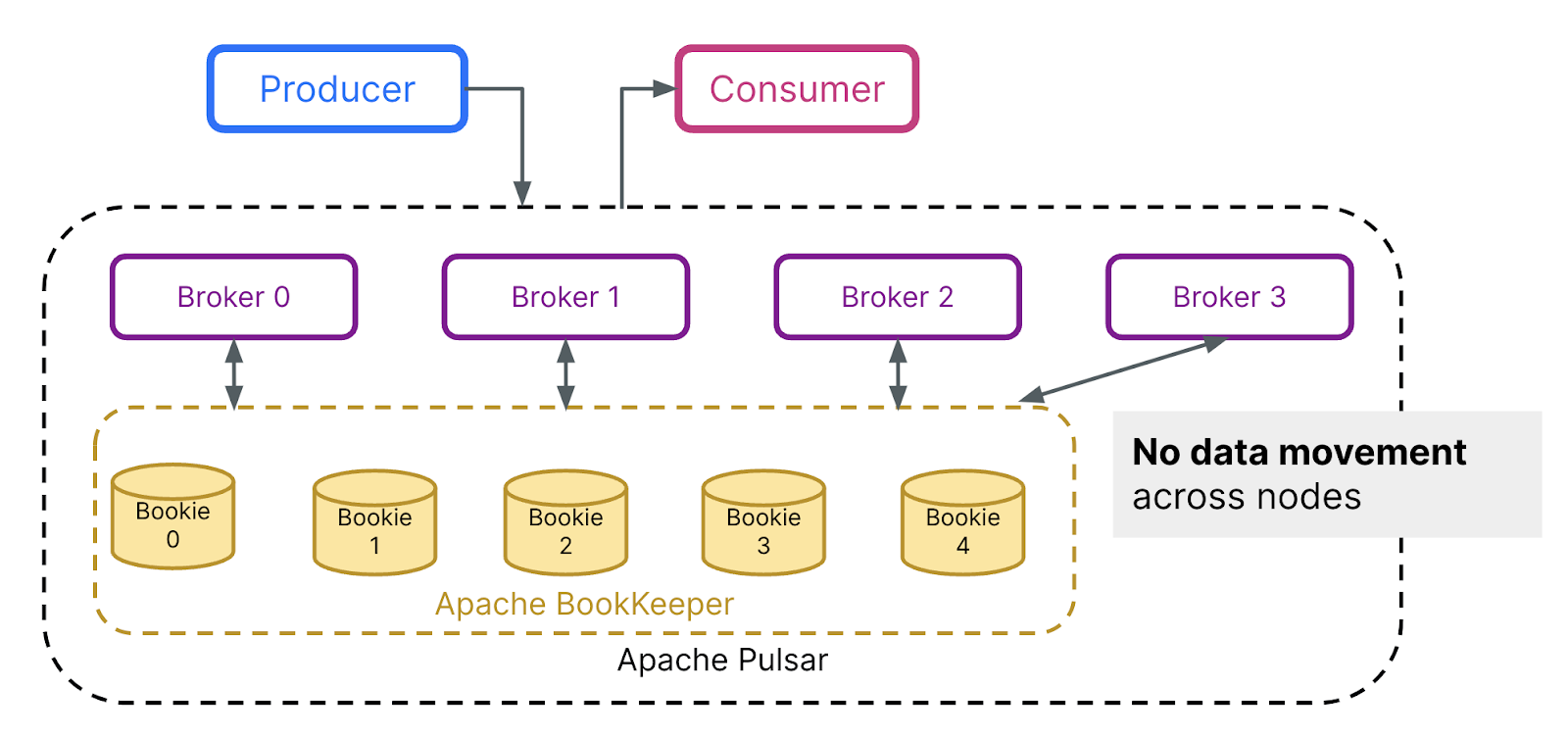 In contrast, Apache Pulsar decouples data serving and storage into two distinct layers: the serving and storage layers. This allows for independent scalability based on capacity needs without the risk of overprovisioning. Crucially, Pulsar uses a segment-based storage architecture that does not require data rebalancing when scaling up storage.
