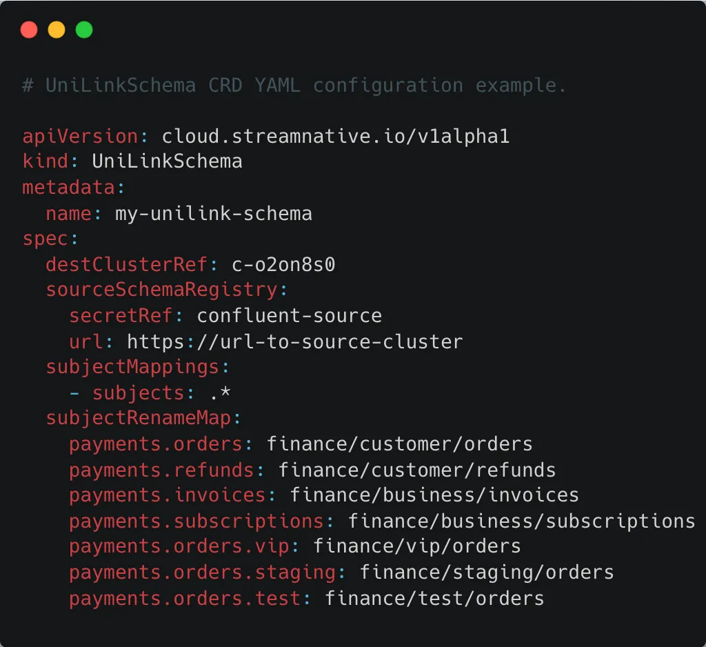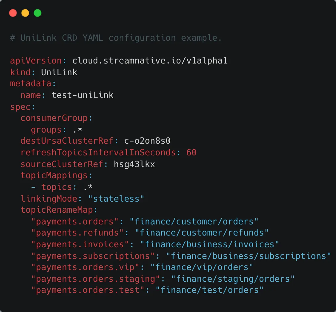 To make re-platforming smoother, UniLink now supports topic-rename mapping. You can mirror payments.orders into finance_orders, reorganize topics under different namespaces, or consolidate topics without breaking schemas or consumer-group behavior. Combined with mode selection, this lets you shape the migration to match your organization: coordinate tightly when you can, or stretch the rollout when you need to.