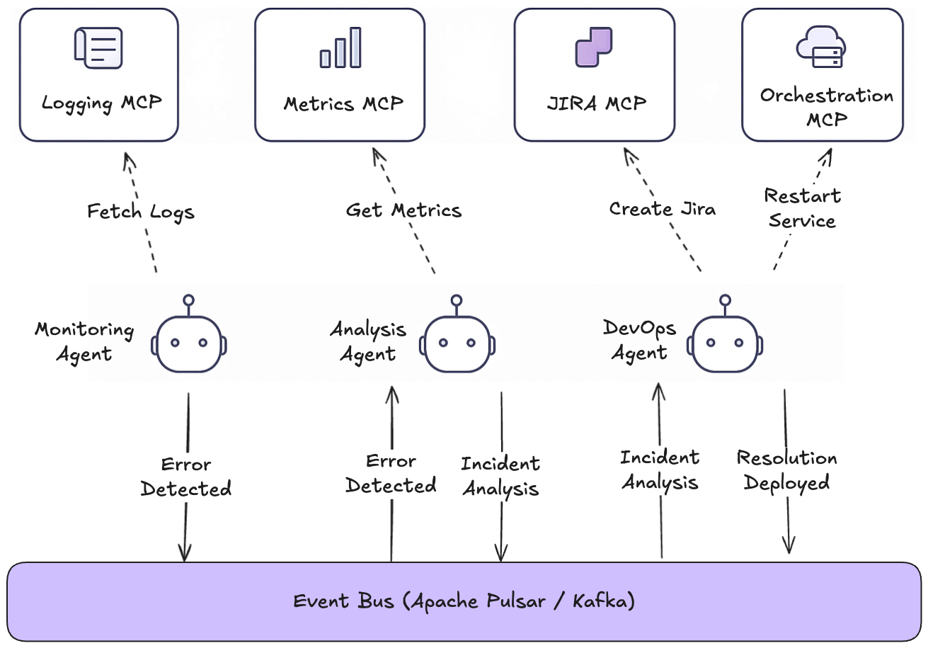 Scenario: Automated Incident Response. Imagine a system with multiple agents: one monitors server logs, one analyzes issues, and one communicates to DevOps tools. They use a real-time event bus (say Apache Pulsar or Apache Kafka topics) to share information. When the monitoring agent detects an error in the logs, it publishes an “ErrorDetected” event onto the bus. The analysis agent subscribes to these events, and upon receiving it, needs more info to diagnose the issue. Here’s where MCP comes in: the analysis agent uses an MCP server for the logging system to retrieve the last 100 lines of logs around the error, or perhaps an MCP server for the metrics database to get the recent CPU usage. With those details (fetched via MCP in seconds), the agent figures out it’s a database connection issue. It then publishes an “IncidentAnalysis” event with findings. The third agent (DevOps agent) picks that up and decides to create a ticket in Jira and restart a service. It uses an MCP server for Jira to file a ticket and an MCP server for the cloud orchestration to restart the service. Finally, it emits a “ResolutionDeployed” event on the bus.