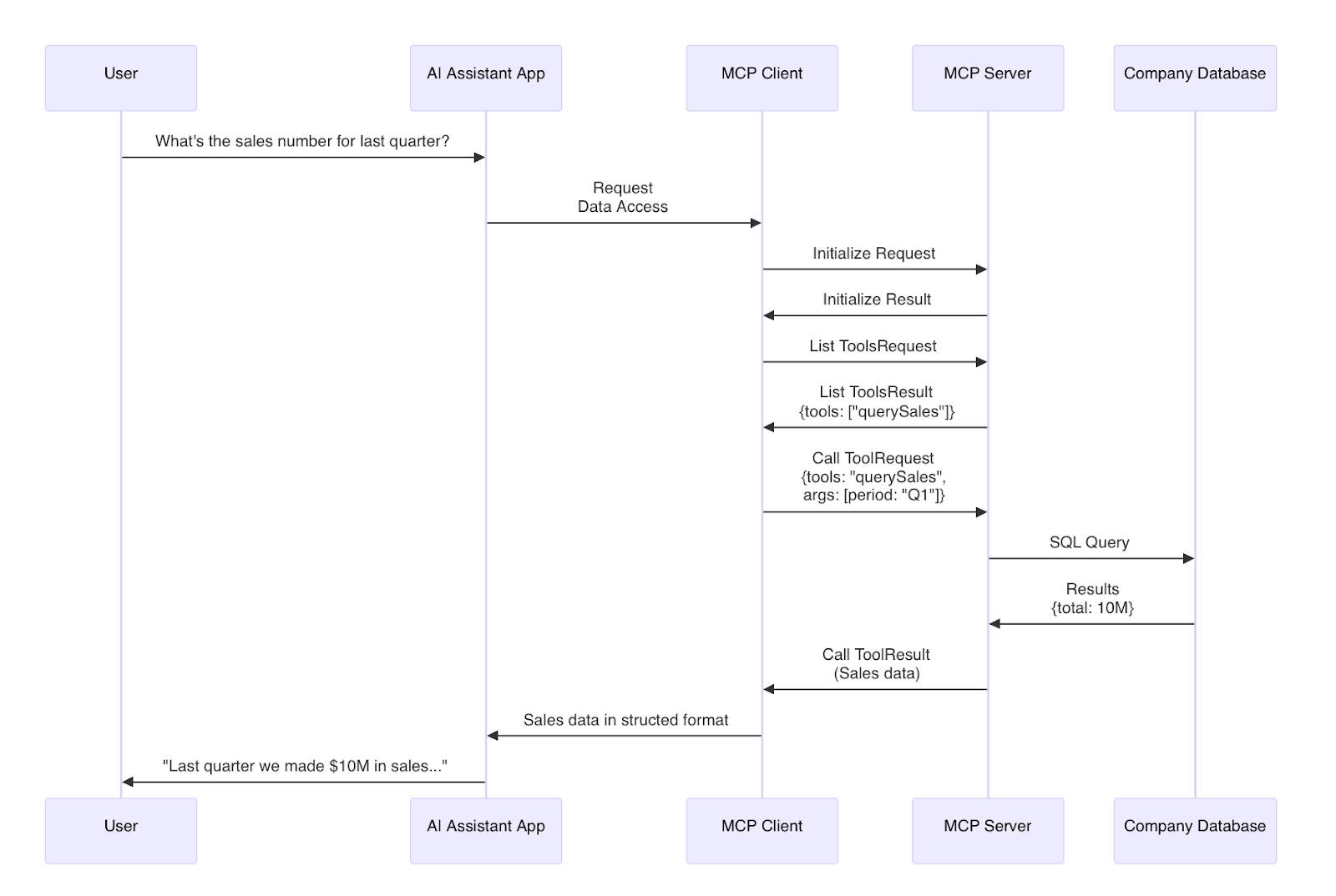 To visualize how MCP facilitates an interaction, consider a simple example of a single AI assistant answering a question using a database via MCP. The sequence might look like this: