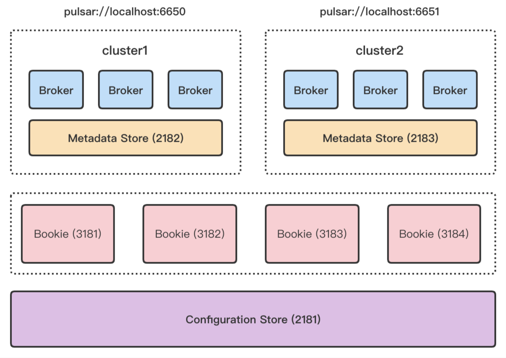 - Deploy two Pulsar clusters that share one BookKeeper cluster