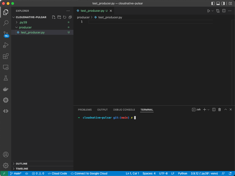 - You can use the icon in the project explorer to create a new Python file, like test_producer.py.