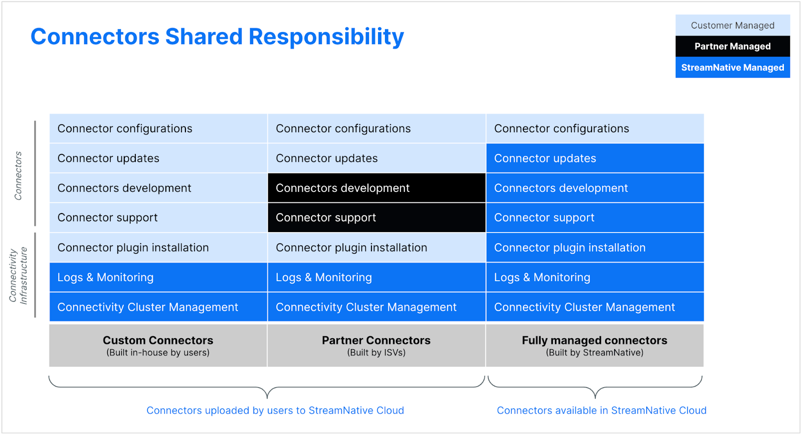 StreamNative Cloud operates under a shared responsibility model for connectors. Enterprise support for fully managed connectors is provided by StreamNative, while support for user-provided connectors involves a shared responsibility between StreamNative and the user. This model ensures robust support while empowering users with flexibility and control over their connectors.