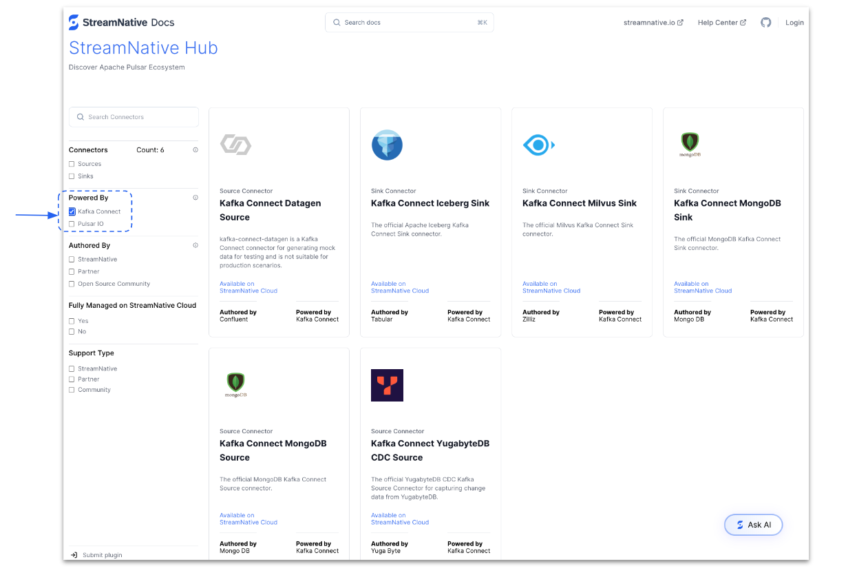 StreamNative Hub provides more than 50 connectors in StreamNative Hub. You can filter connectors by Kafka Connect or Pulsar IO.
