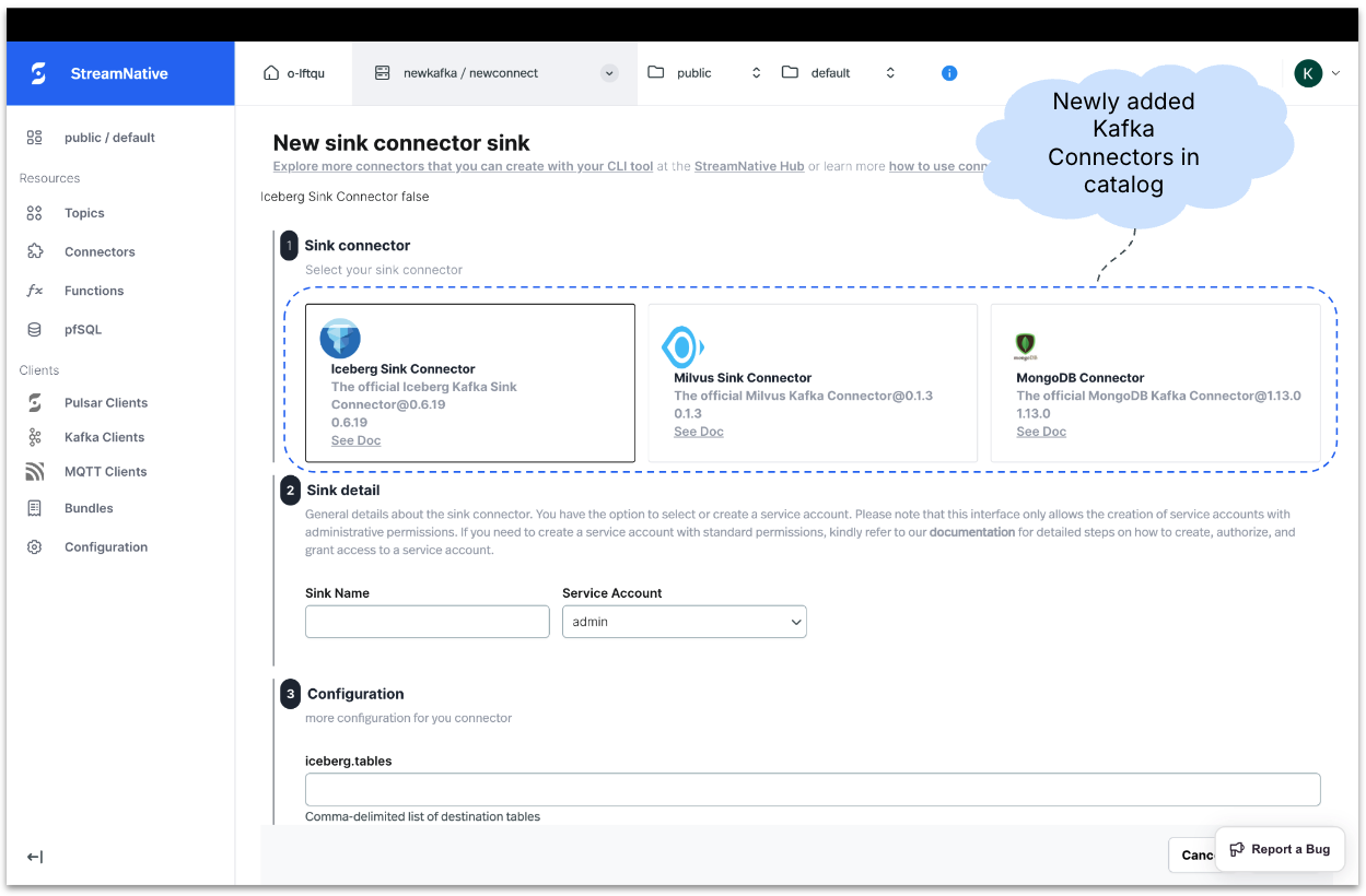 Users can quickly build a data pipeline by creating a connector in just seconds. StreamNative Cloud's built-in connector catalog provides a wide selection of connectors, including the newly added Kafka Connectors. Users simply select a connector, enter the required configuration, and deploy the connector with ease.