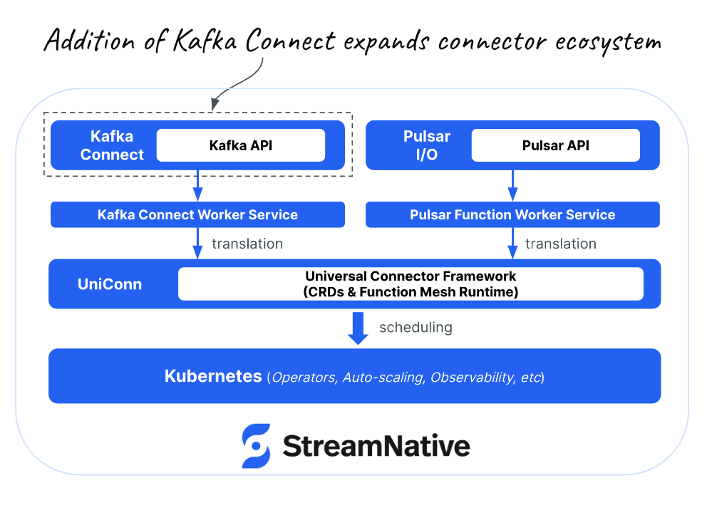 StreamNative has long supported Pulsar IO, a framework for building connectivity with Apache Pulsar. With the introduction of UniConn, StreamNative now extends support to run Kafka Connect-based connectors within StreamNative Cloud. Kafka Connect, an open-source framework, is designed for developing connectors that link external data stores to Kafka clusters.