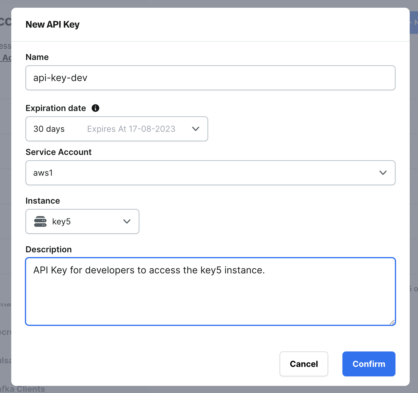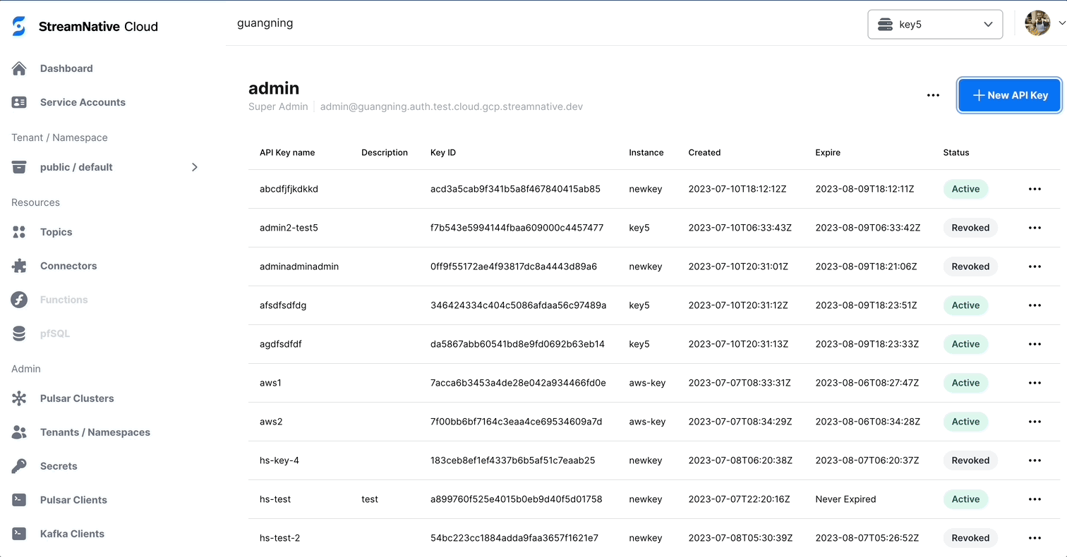 StreamNative API keys can be created and managed from within the StreamNative console, to easily grant and revoke API access to users, applications, or third-party services. Create a key by specifying a service account, instance, and expiration date.