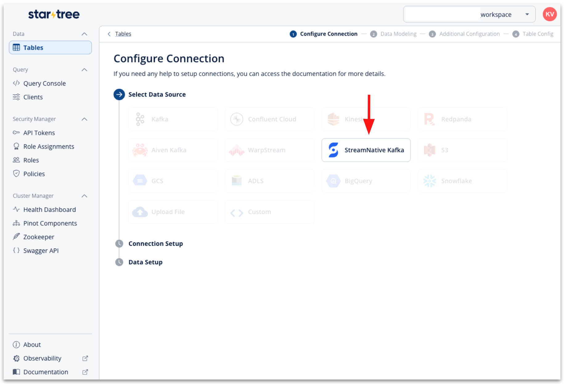 - Selecting StreamNative Kafka as a data source in StarTree Cloud