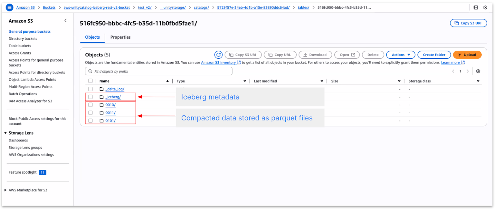 The Iceberg tables, comprising data stored in Parquet files along with metadata such as snapshots and supporting files, are located in the directory highlighted below.