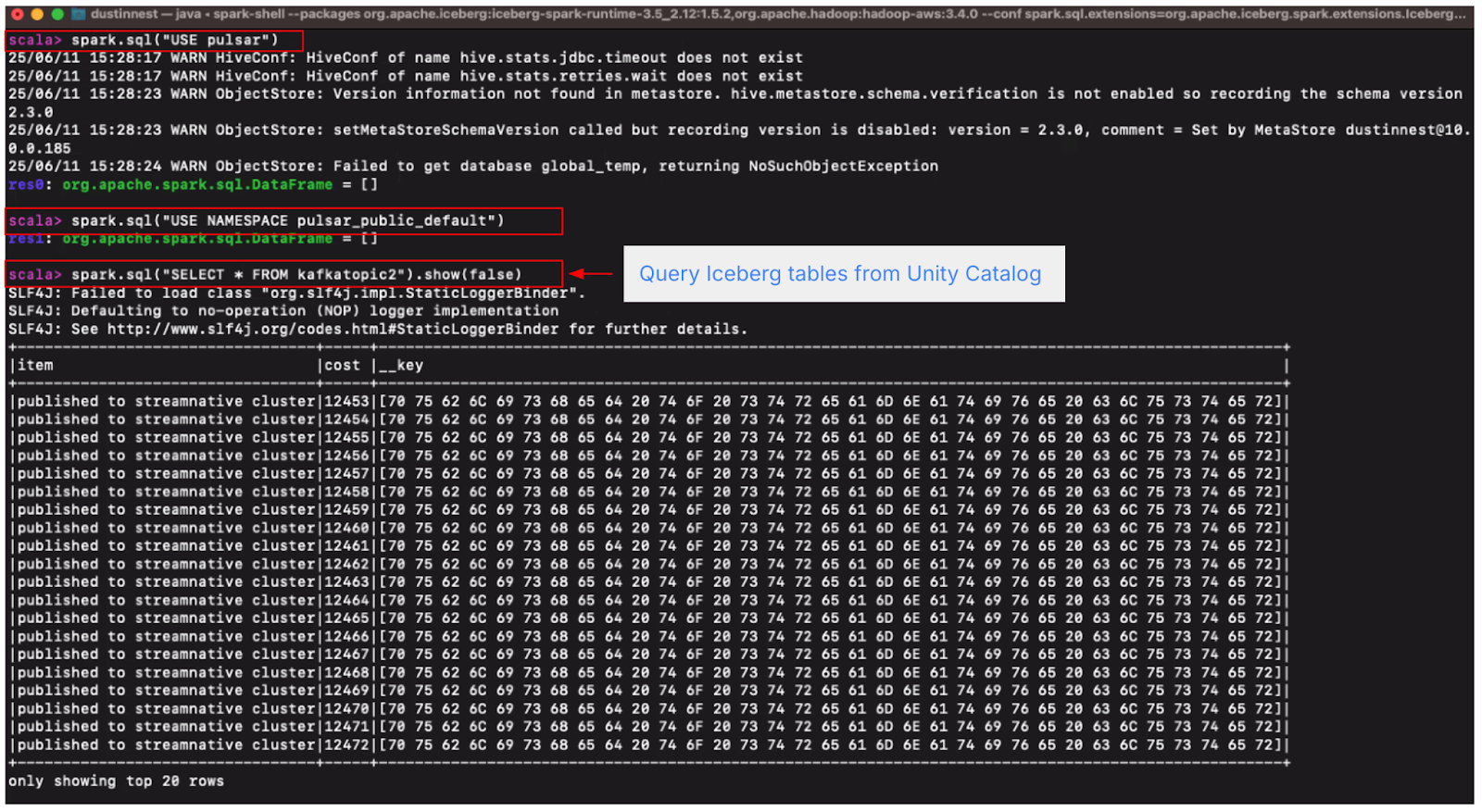 Once topic data is ingested as Iceberg tables and published to Unity Catalog, it becomes accessible for querying through a variety of external tools. The example below demonstrates how users can query these Iceberg tables using Spark SQL.