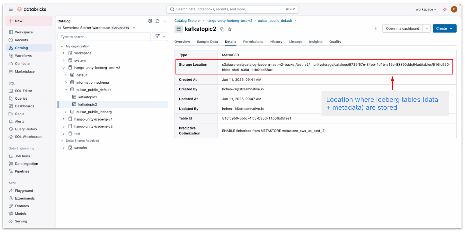 This design ensures that real-time streaming data ingested via Pulsar is immediately queryable, governed, and fully versioned within the Unity Catalog-managed Iceberg table.